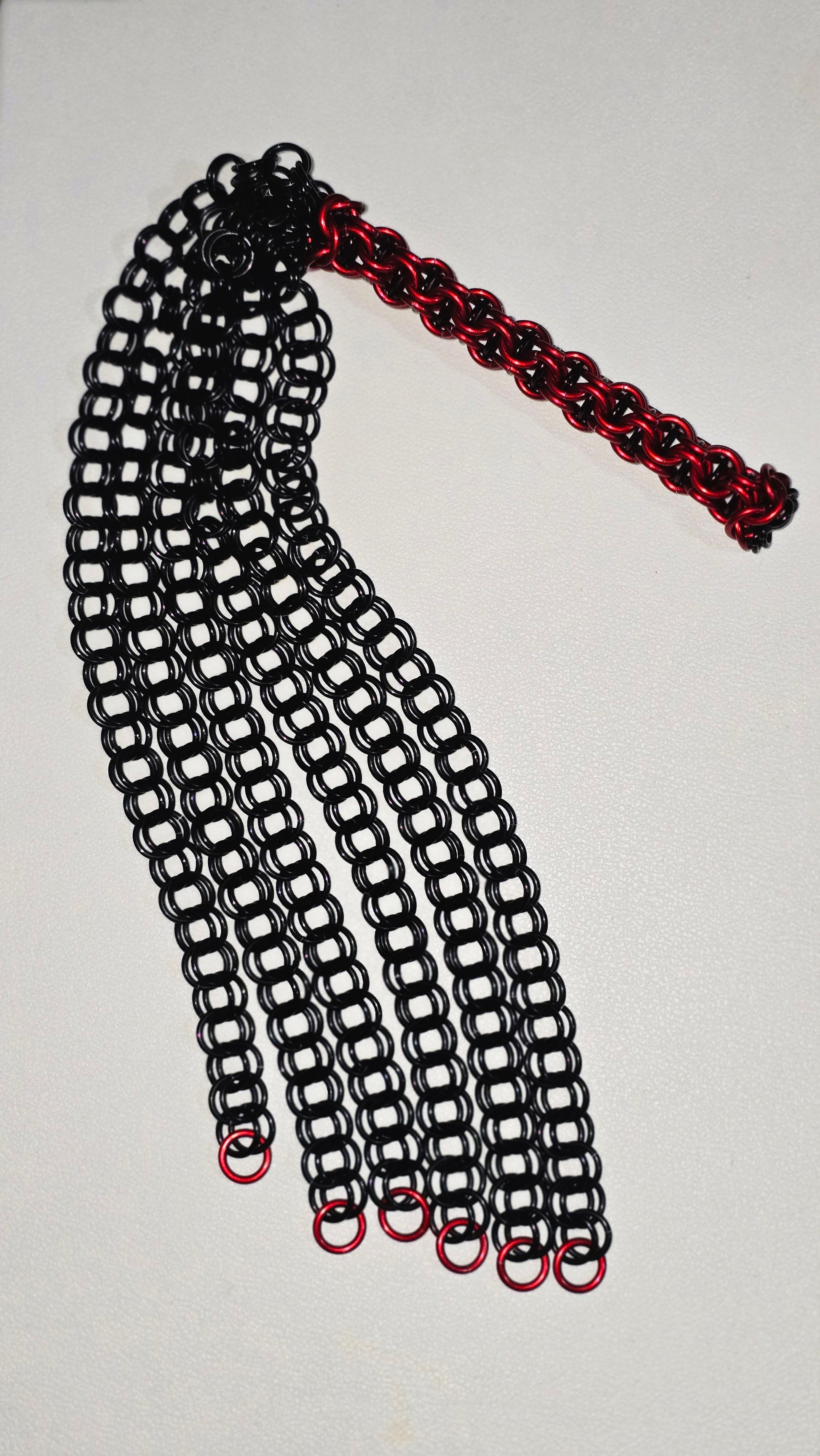 The ultimate ASMR toy for your bedroom! These handmade chainmail Floggers not only sound appealing, but feel amazing aswell. This whip comes with 6 strands of 69 rings each attached to a handle made entirely of chainmail! These give the best of both worlds (bite and punch) for your masochist partner!